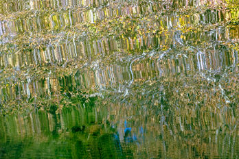 The reflected shoreline of lava fields, conifer forests, vine maple and aspen trees casts fields of tessellations.